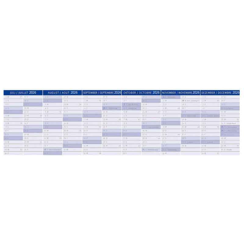 Der Tischkalender enthält 106 Seiten Kalendarium, 18 Seiten Infoteil. Es sind im Kalendarium alle DE, AT, CH, FR Feiertage und die Ferien der deutschen Bundesländer hinterlegt. 1 Woche = 2 Seiten.