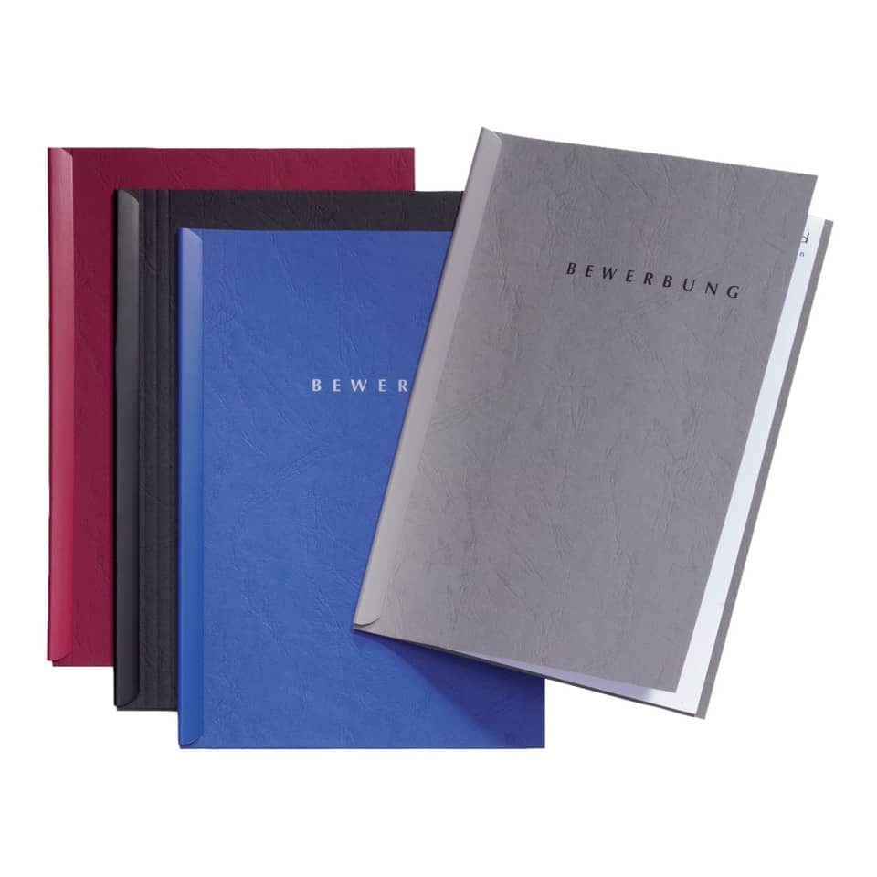 Die Vorder- und Rückseite sind aus hochwertigem Strukturkarton. Auf der Vorderseite ist das Wort Bewerbung in silbernen Lettern aufgedruckt. Dank Klemmschienentechnik werden bis zu 30 DIN-A4-Blätter Unterlagen sicher und ordentlich in der Bewerbungsmappe zusammengehalten.
