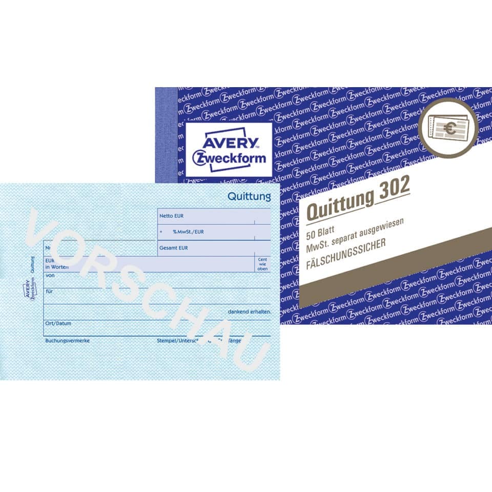 Die Quittung 302 von AVERY ZWECKFORM im DIN A6 Querformat ist mit einem feinen, netzartigen Sicherheitsdruck ausgestattet. Somit ist die Quittung fälschungssicher. Das Quittungsbuch beinhaltet 50 vorgedruckte, mikroperforierte Quittungsvorlagen, die MwSt. wird separat ausgewiesen. Die Quittungen und Vordrucke von Avery Zweckform sind zuverlässige, bewährte Hilfen für Ihre Warenwirtschaft, Buchhaltung und Steuer. Die Formulare werden regelmäßig von Rechtsexperten geprüft.