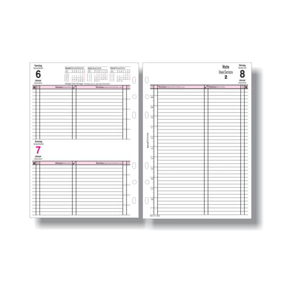 Aufteilung: 1 Tag/1 Seite. Sie können Termine, Aufgaben oder Erinnerungen in einer Stundeneinteilung von Mo-Fr 8-18 Uhr eintragen.
