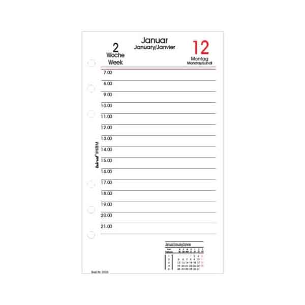 Aufteilung: 1 Tag/1 Seite. Sie können Termine, Aufgaben oder Erinnerungen in einer Stundeneinteilung von Mo-Fr 7-21 Uhr eintragen.