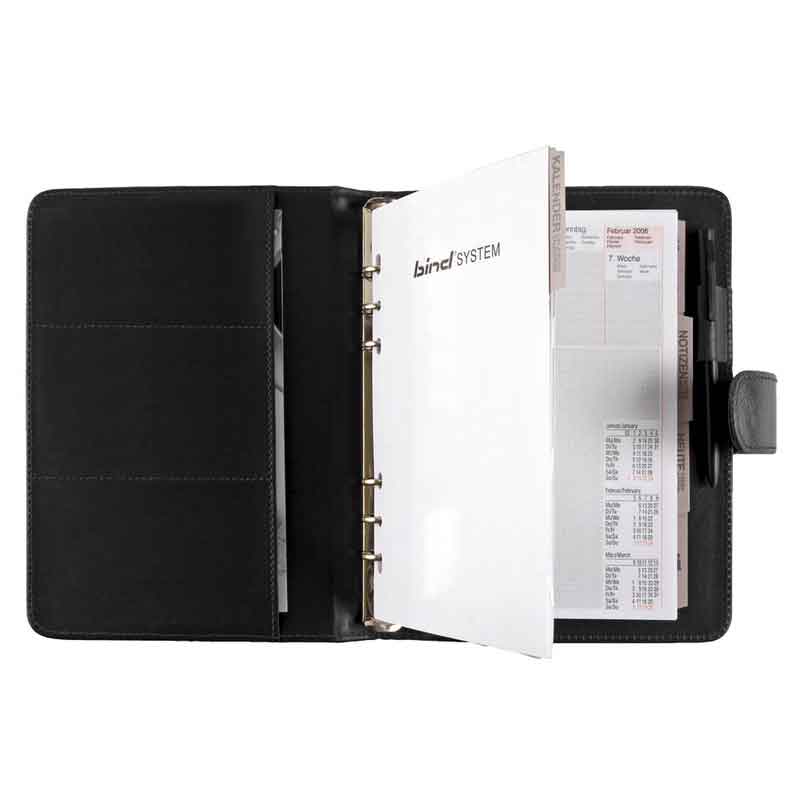 Der Terminplaner besitz praktische Einsteckfächer für Visiten- oder Kreditkarten. Er hat eine schwarze Leder-Optik. Die Lieferung beinhaltet: Kunststoff-Trennblätter, 12 Adressen A-Z, 15 Blatt Adressen, 13 Blatt Heute, 45 Blatt Notizen, 5 Blatt Finanzen und Register A-Z.