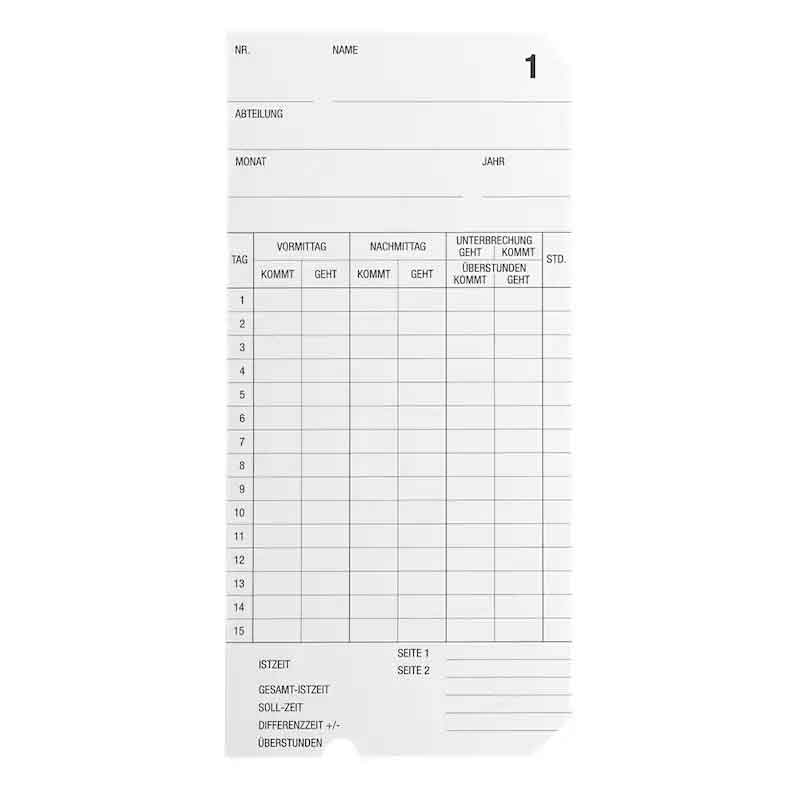 Stempelkarten passend für die Zeiterfassungs-Modelle BÜRK MOBATIME K 600, 800, 895, 1000, 1200, 1250, 1300, 1400, 2000, 2100, 2200 geeignet.