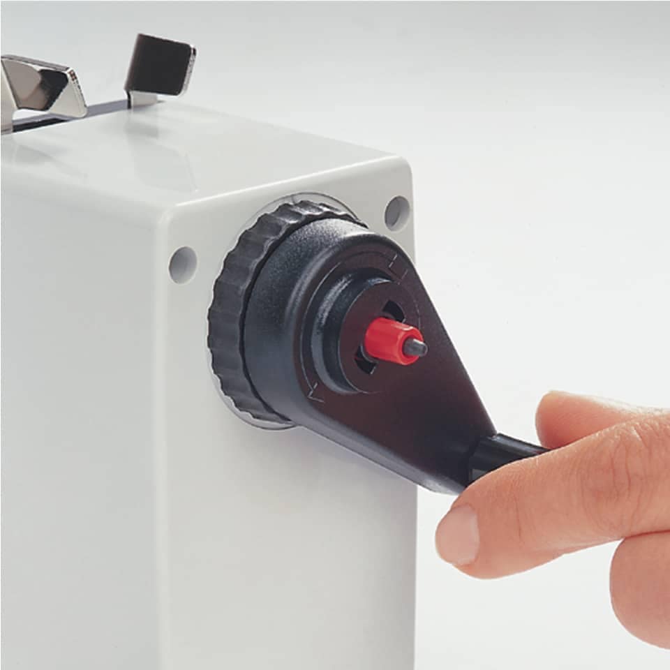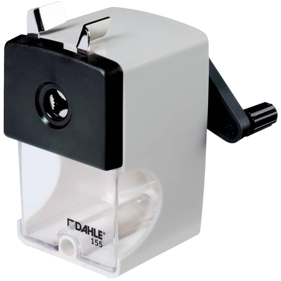 Bleistiftspitzmaschine Dahle 155. Für Stiftdurchmesser bis 12mm, automatischer Spitzstopp. Spitzenform einstellbar. Stahlfräser. Kunststoffgehäuse mit transparentem Spänebehälter. Befestigung mit Zwinge. Dank seines großen Auffangbehälter muss man es nur selten ausleeren.