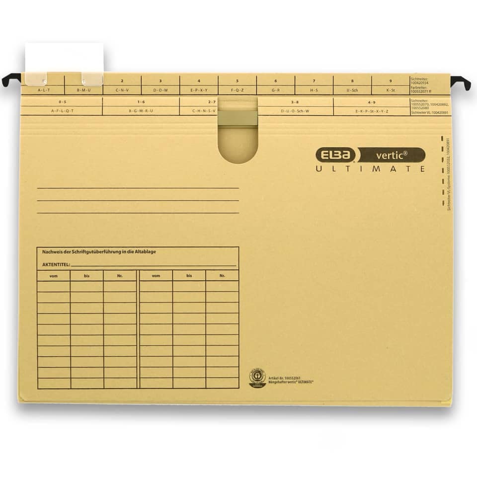 Die Hängehefter ELBA vertic ULTIMATE mit kaufmännischer Heftung und Tasche sind die perfekte Aufbewahrungsmöglichkeit für Ihre Akten und Unterlagen. Sie sind sehr stabil und langlebig, durch den hier verwendeten 240g/m2 extrastarken Karton. Die stabilen, 34,8cm langen Metall-Hängeschienen gewährleisten, dass der Ablagehelfer auch mit vielen Papieren beladen sicher hängt. Die Hängehefter besitzen einen Sichtreiter mit aufklappbarer Rückwand und auswechselbarem Beschriftungsschildchen.