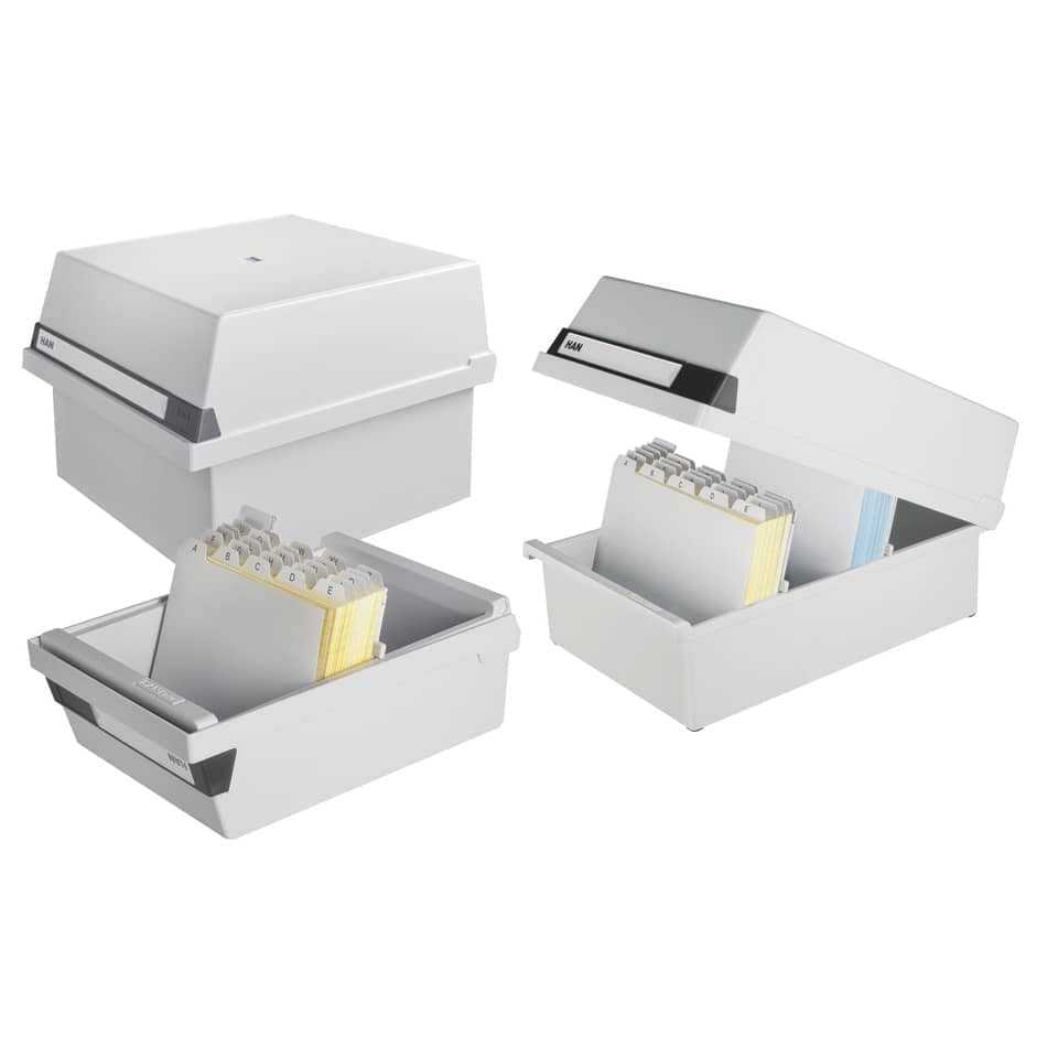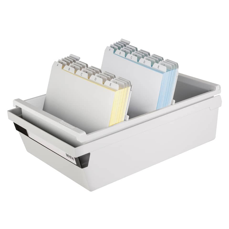Inkl. 2 Stützplatte mit Sichtreiter. Fassungsvermögen: 1300 Karten. Verwendung für Kartenformat: DIN A4, DIN A5, DIN A6 quer.