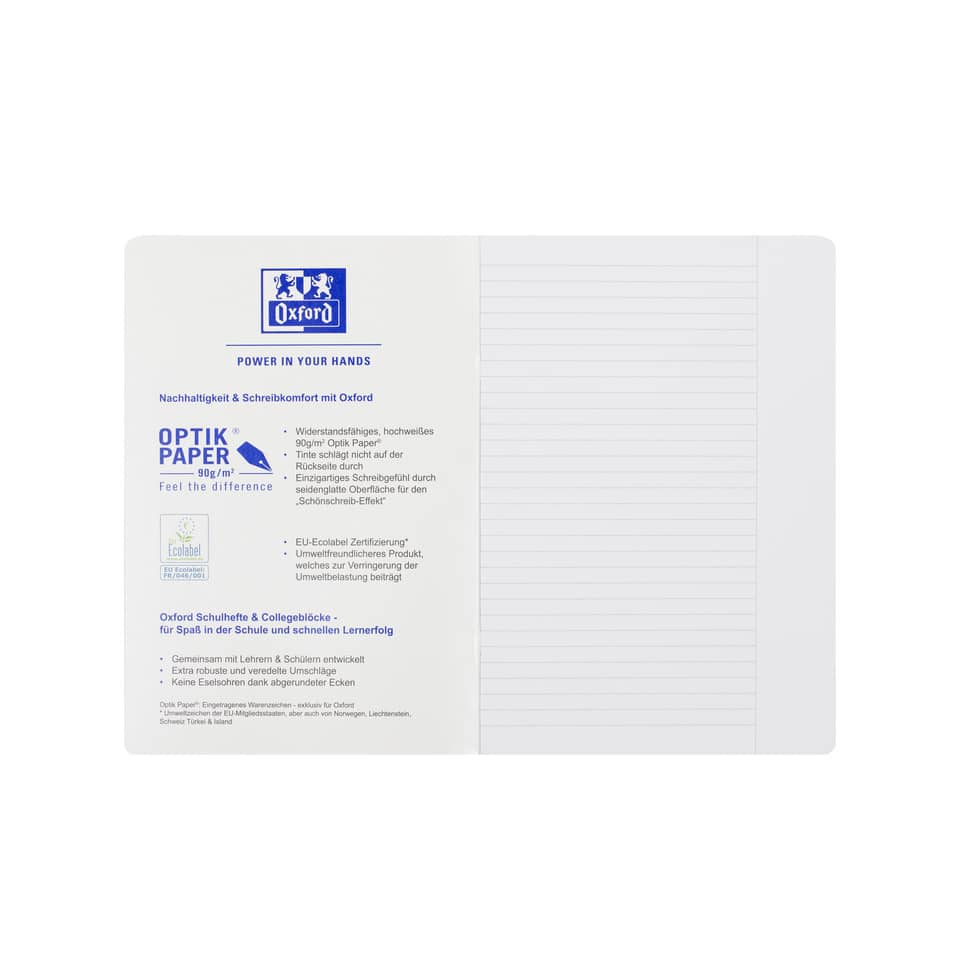 Das Oxford Touch Schulheft Format A4 ist ideal für die Schule. Durch die runden Ecken des Einbandes werden Eselohren verhindert. Das 80g/qm Papier ist so stark, dass keine Tinte auf die andere Seite durchschlägt.