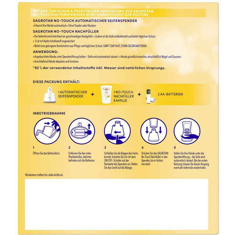 In diesem Set erhält man einen Spender und die Flüssigseife Kamille. Man kann den Spender immer wieder mit verschiedene SAGROTAN® Nachfüllseifen wieder befüllen.