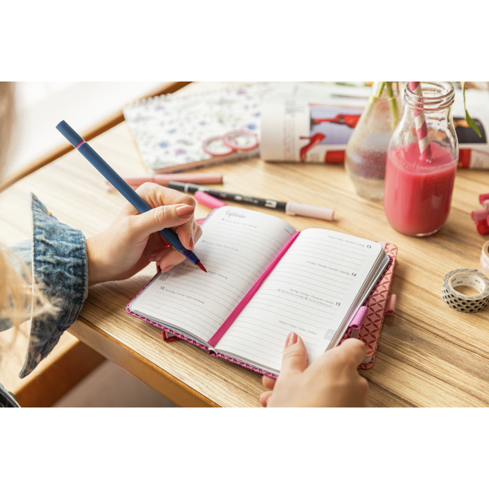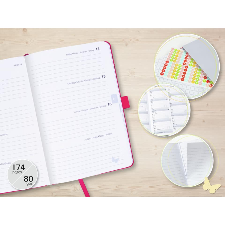 Der Kalender ist aufgeteilt in 106 Seiten Kalendarium, 41 Seiten Infoteil, 27 Notizseiten (12 davon zum Heraustrennen). Zusätzlich gibt es 2 Seiten mit einer kompletten Wochenübersicht. Man hat mit diesem Kalender die Wochen immer übersichtlich im Blick und ausreichend Platz für Einträge.