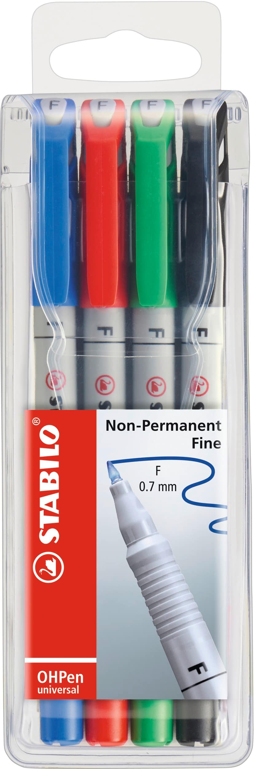 Feinschreiber Folienstift STABILO® OHPen universal. Typbezeichnung der Mine: Kapillarspeicher. Ausführung Spitze: Schreibdocht, geeignet für Schablone. Schreibflüssigkeit: geruchsarm, auf Alkoholbasis. Schreibt auf fast allen glatten Oberflächen. Rutschfeste Griffzone. Farbe der Kappe: in Schreibfarbe. Material des Clips: Kunststoff. Farbe des Schaftes: hellgrau.