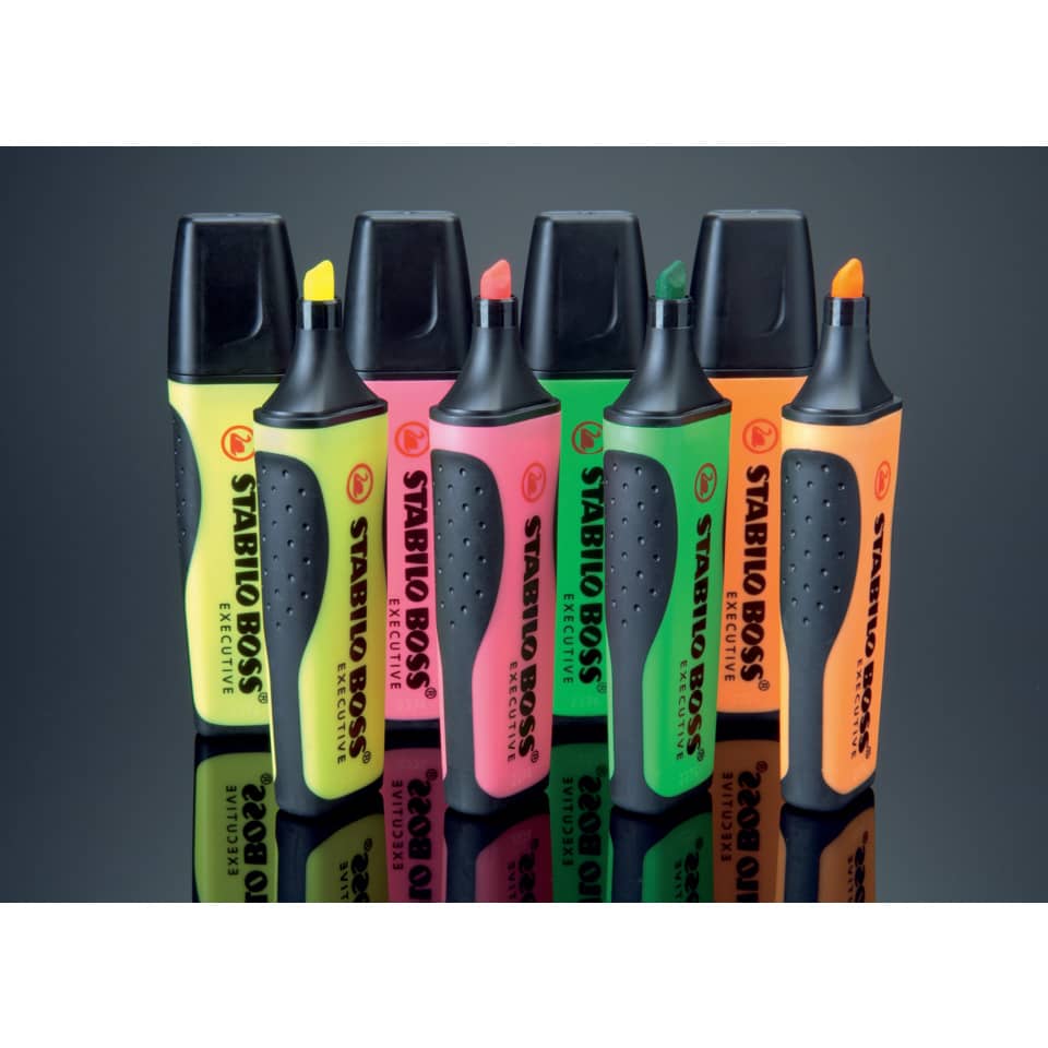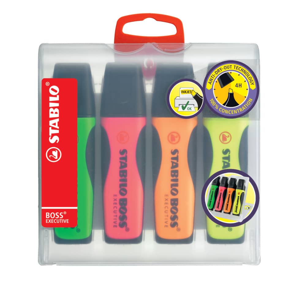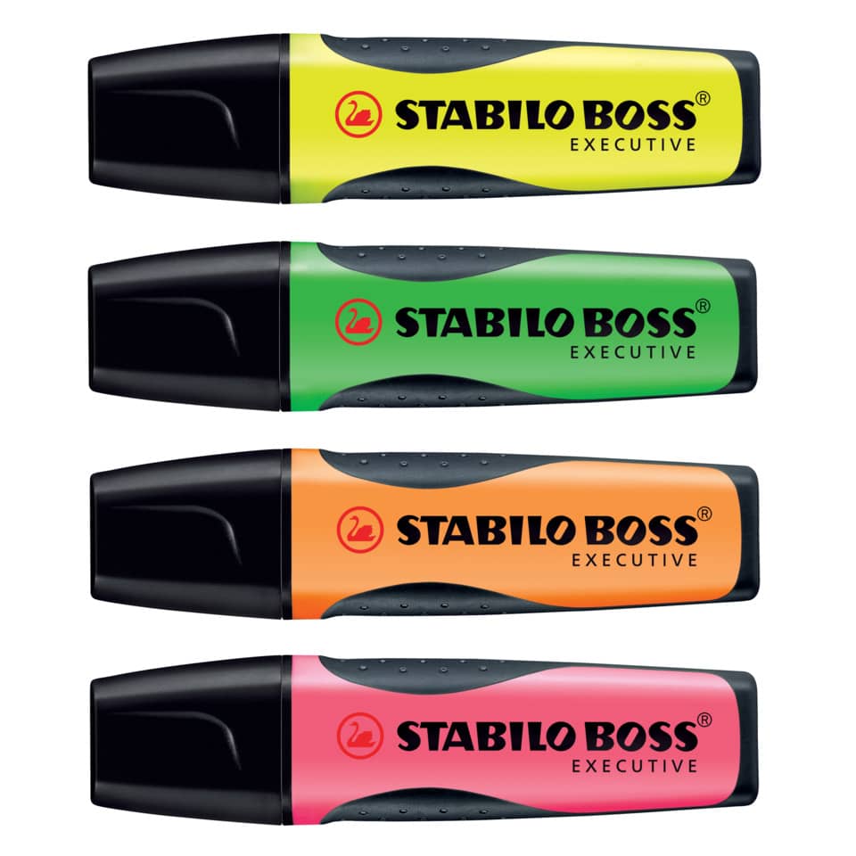 Premium-Textmarker STABILO® BOSS® EXECUTIVE Etui, Inkjet geeignet, Art der Schreibflüssigkeit: geruchsfreie Tinte auf Wasserbasis, Tintenspeicher-Technik: Kapillarspeicher, STABILO Anti-Dry-Out Technology: 4 Stunden Austrocknungsschutz für konzentriertes Arbeiten. Klassische Form mit weicher ergonomischer Griffzone, Farbe des Schaftes: schwarz mit Schreibfarbe, als Tischset nutzbar.