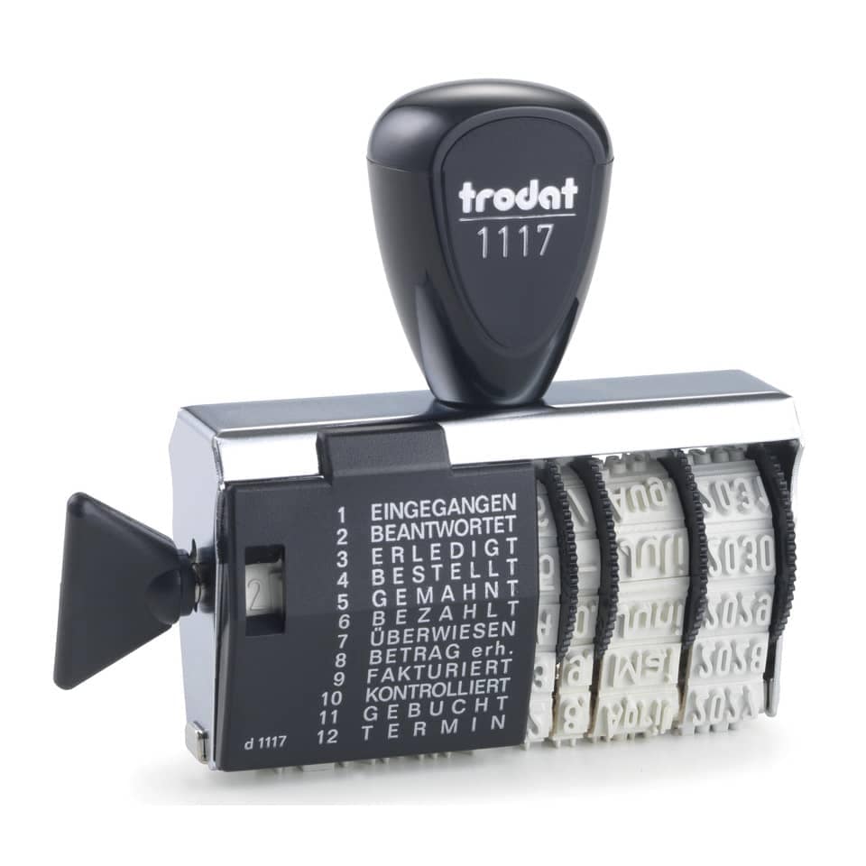 Ideal um Ordnung von Briefen und Unterlagen zu bewahren. Größe 8,0 x 7,0 x 2,0cm, Abdruckgröße ca. 5,4 x 0,4cm. Die Texte werden individuell mittels Stellschlüssel verstellt. Das Datum (Monat in Buchstaben) lässt sich ebenfalls individuell einstellen.